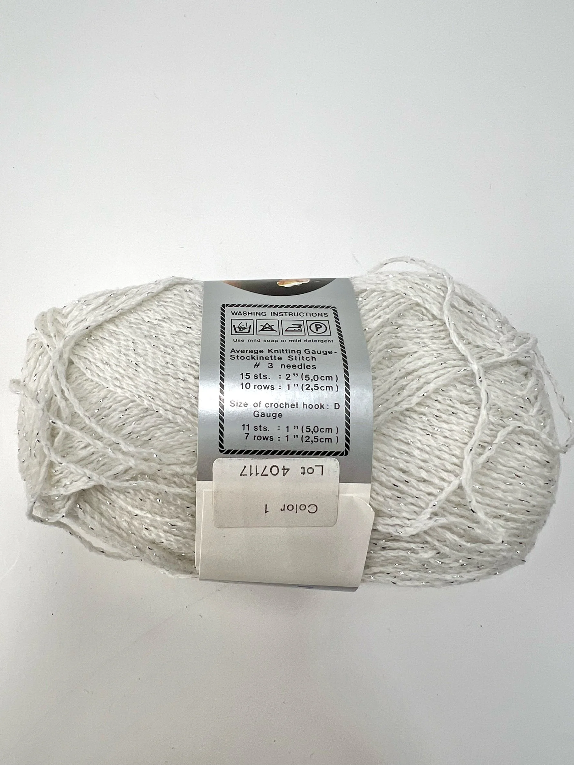 This fingering weight yarn leaves you with lots of options, from making something delicate with this yarn alone or adding it to another to really spice up your project! 100% wool with lurex. 240 yards, #3 knitting needle, 15 sts = 2", 10 rows = 1". 50% of sales go towards The Loose Ends Project (learn more at www.looseends.org). Imported from Finland and beautifully stored for years, this yarn come from Pirjo (PEER-EE-OH), who had shops in the DC metro area. She retired, and she decided to donate her stash to the Loose Ends Project, who contacted us and asked for a collab. We are honored to sell this yarn to support their work, especially as their main funding source, Joann's, is no longer with us.