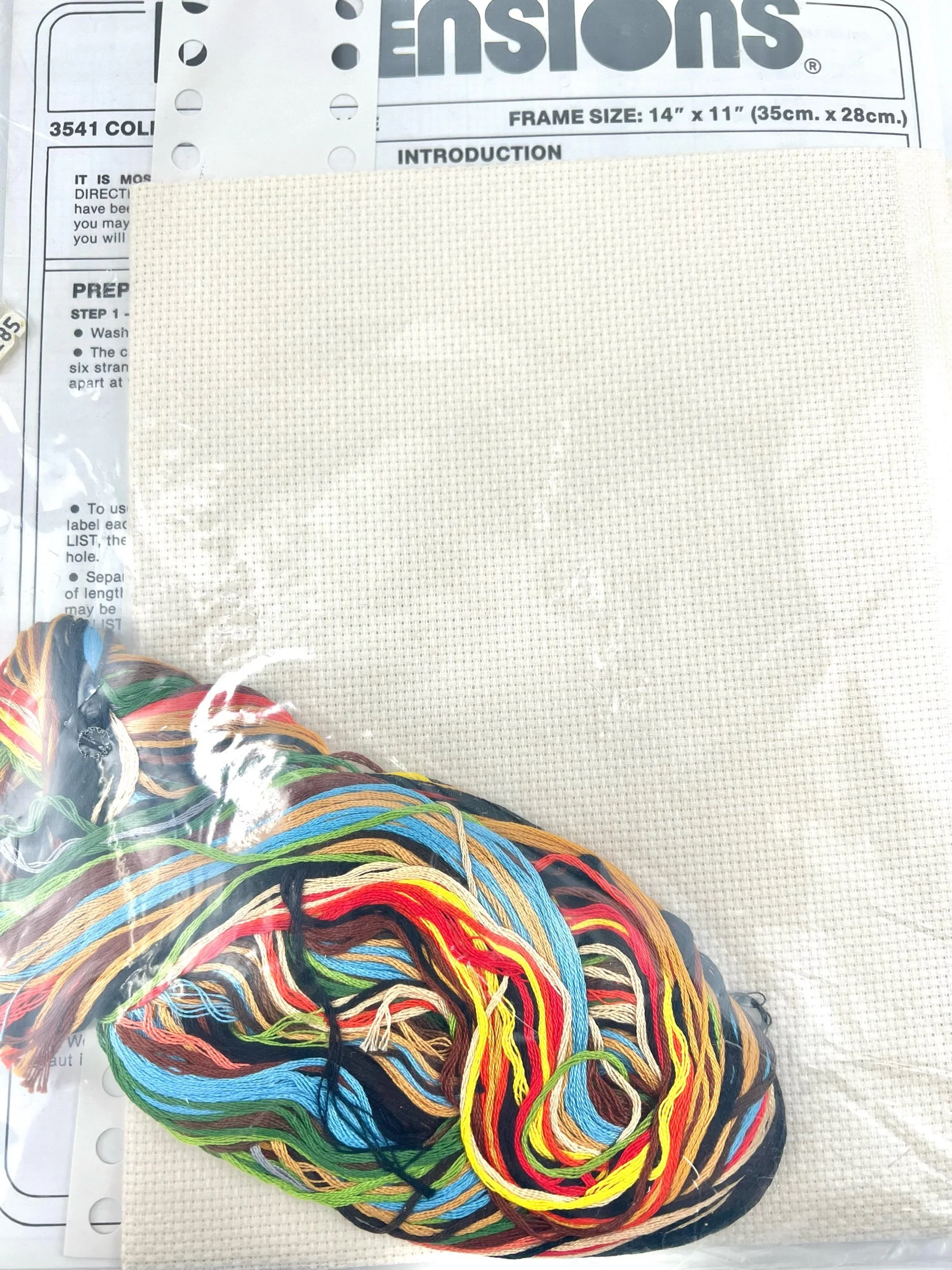 14" by 11", includes cotton embroidery thread, 14 count aida cloth, needle, and instructions