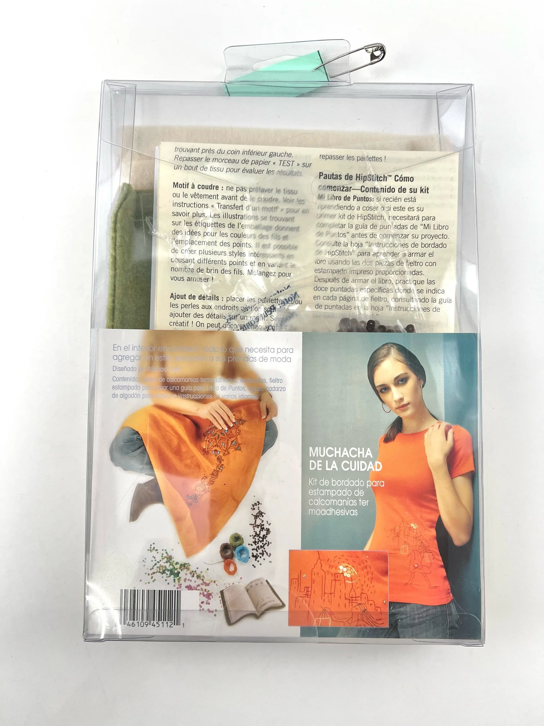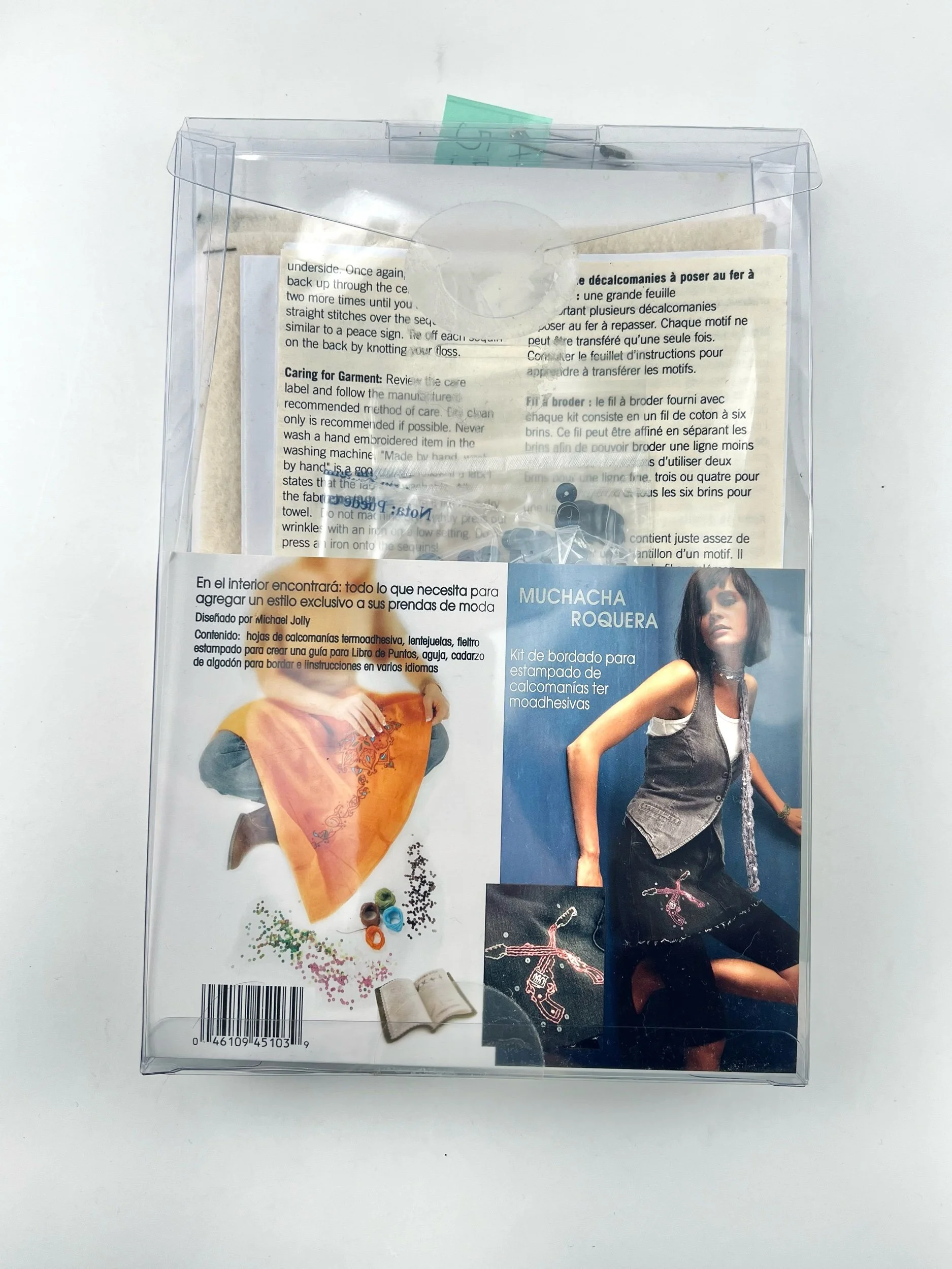 Includes iron-on transfer sheet, sequins, stamped felt to create a stitch book guide, a needle, cotton embroidery floss, and instructions