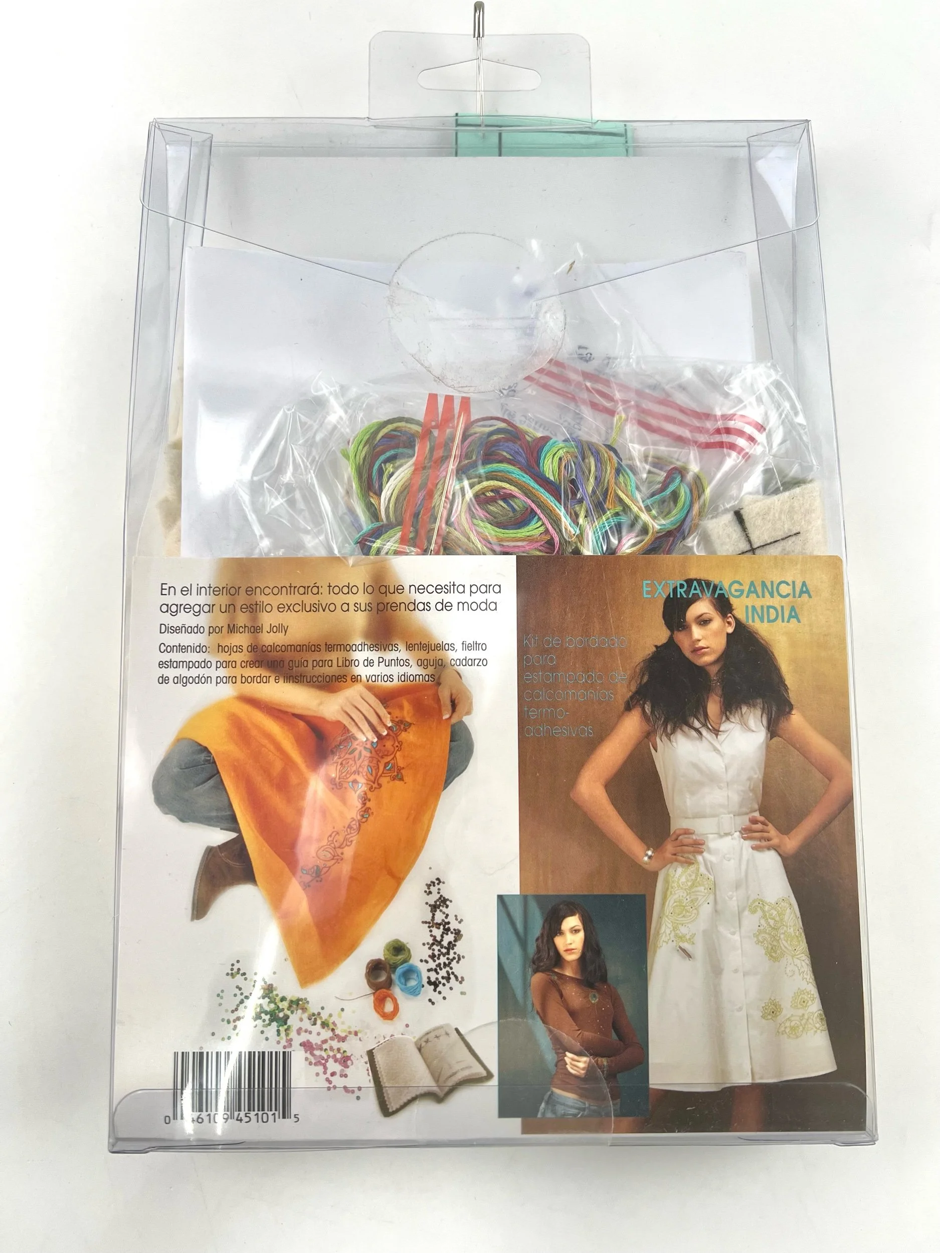 Includes iron-on transfer sheet, sequins, stamped felt to create a stitch book guide, a needle, cotton embroidery floss, and instructions