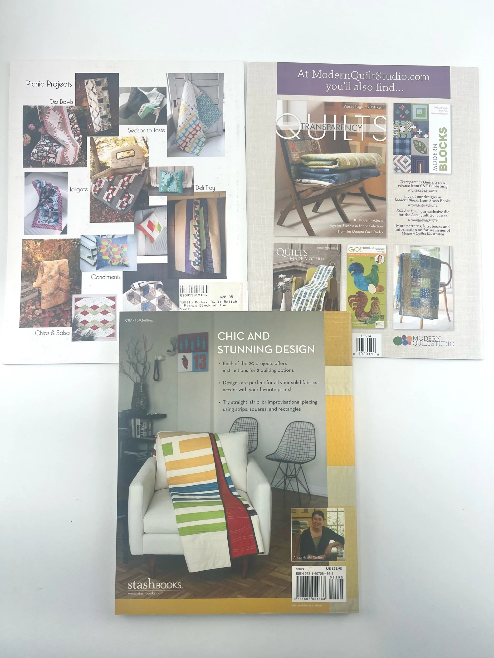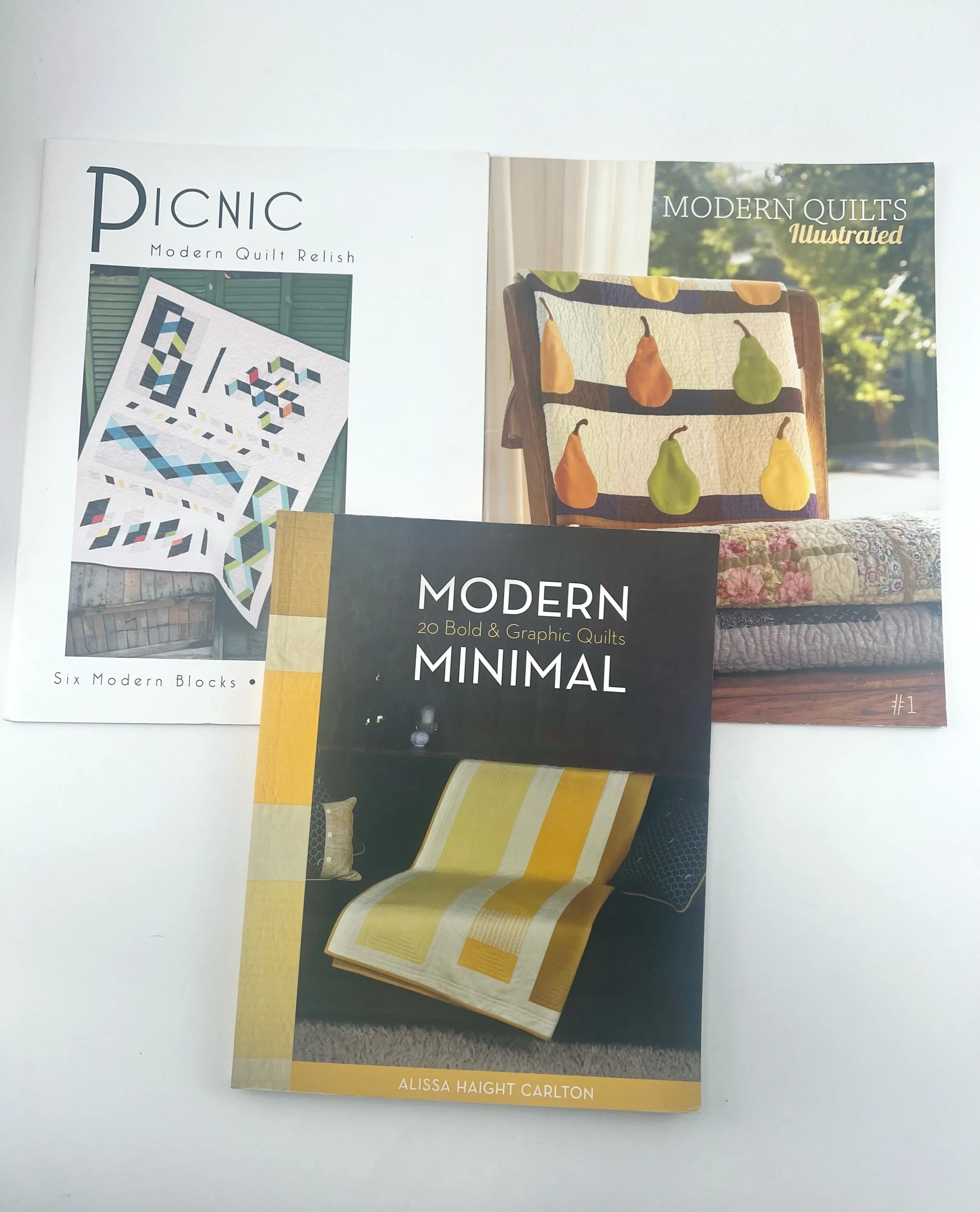 "Modern Minimal", "Modern Quilts Illustrated", and "Picnics Modern Quilts Relish"